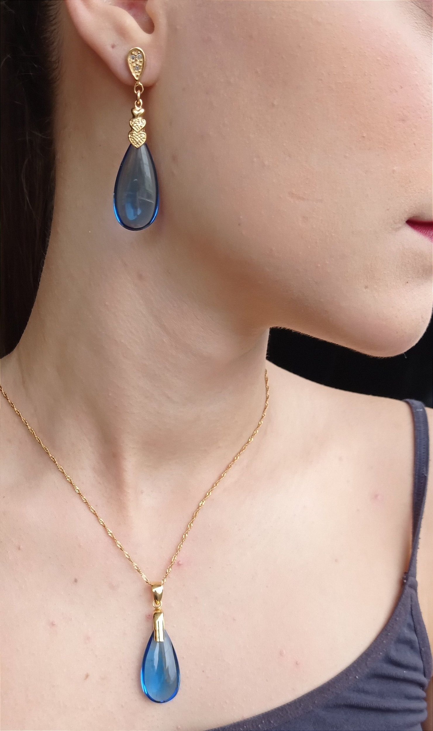 Conjunto semijoia banhada a ouro 18k de Zircônia Azul safira abaulada.